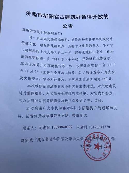 11月22日,因華陽宮古建筑群部分設施陳舊老化,建構筑物急需修繕,即日起進入全面施工修復階段。濟南城市建設集團華陽宮及華山風景區建設管理項目部發布濟南市華陽宮古建筑群暫停開放的公告。