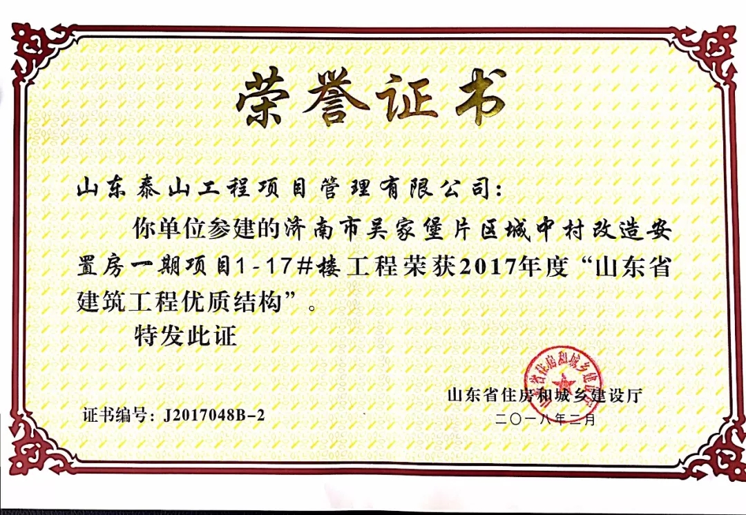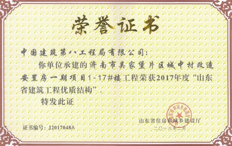 質量是企業的生命。在山東省住房和城鄉建設廳組織的2017年度“山東省建筑工程優質結構”評審中,吳家堡片區安置房一期工程1#到17#樓(共計17棟樓),憑借過硬的質量、完善的管理順利通過專家考評,喜獲“山東省建筑工程優質結構”。“山東省建筑工程優質結構”代表著全省各建筑企業施工質量管理的領先水平,為沖刺山東省建筑工程質量最高榮譽“泰山杯”奠定了基礎。