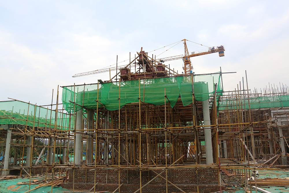 城門樓的工程量最大,項目內施工難度最大的是緊靠城門樓的一棟2.5層(局部三層)的中西結合建筑,該建筑內部為錯層結構,樓板需要逐層澆筑,同時還有單層挑高8米的高支模(高支模是指支模高度大于或等于5m時的支模作業)作業,施工方案經專家反復論證后施行,為保證工期,這棟2.5層的“小建筑”最多80位工人同時施工。同樣,為了整個項目的推進速度,項目高峰作業期400多位工人同時施工,保證項目按質按量推進。