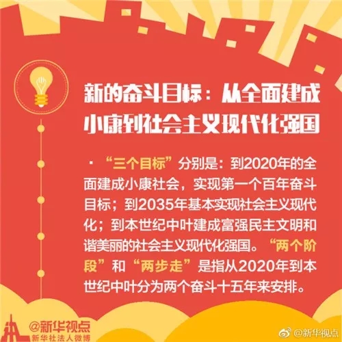 中國共產黨九十多年的歷史,不就是這三個大的段落嗎?第一個段落,我們實現站起來的目標;第二個段落,我們逐步地富起來了;第三個段落我們正在努力地強起來。我們跟過去比已經很強了,當然跟有些發達國家比我們還不夠強,我們要進一步地強。接下來的目標就是建設社會主義現代化強國。過去,我們“第二個百年奮斗目標”講的是本世紀中葉,就是中華人民共和國成立一百周年的時候,要基本實現社會主義現代化,但是現在大家注意到,改成了建成社會主義現代化強國。