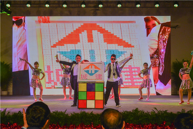 在歡快喜悅的歌舞《拜新年》中,匯演拉開序幕,紅紅火火的舞臺(tái),映射著蒸蒸日上的發(fā)展勢(shì)頭。舞蹈《成長(zhǎng)》《奮進(jìn)》以激昂的音樂(lè),吹響了催人奮進(jìn)的號(hào)角,用動(dòng)感的舞步,舞出了城建鐵軍的蓬勃朝氣。《馬路情緣》《鐵軍男相親記》《生日》《真相》《男爭(zhēng)女辯》《筑夢(mèng)同行》等語(yǔ)言類節(jié)目圍繞生產(chǎn)經(jīng)營(yíng)精心編排,真實(shí)感人,催人奮進(jìn)。勵(lì)志感人的歌曲,絢麗多彩的歌伴舞,酷炫的舞蹈,神秘的魔術(shù),魔幻的黑光劇,生龍活虎的京劇,讓觀眾著實(shí)過(guò)了一把眼癮,臺(tái)下掌聲不斷,歡欣喜悅的氣氛一浪高過(guò)一浪。小品里父母、妻子、孩子那一段段心里話,令人感同身受,潸然淚下,家屬們用實(shí)際行動(dòng)表達(dá)了對(duì)企業(yè)最大的理解和支持,大家在這個(gè)溫暖的大家庭中,以誠(chéng)相待,溫馨彼此。在激動(dòng)人心的歌舞串燒《開創(chuàng)未來(lái)》中,匯演圓滿落下帷幕,集團(tuán)領(lǐng)導(dǎo)與演職人員合影留念。