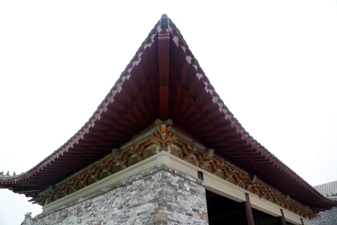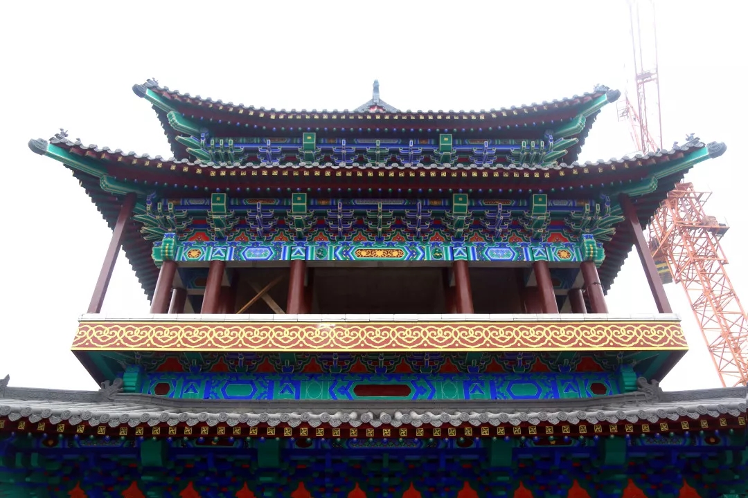項目所有建筑中,城門樓是工程量最大、工期最長的單體建筑,其中,城墻全部采用手工磚砌筑,經過人工修整后的磚塊古樸素雅,并無過分雕飾痕跡。進入城門樓內部,柱與梁之間均為傳統木質斗拱支撐,城門樓的彩繪部分尤為明亮突出,采用的是旋子彩繪形式,一般經過6道工序,一平方米的彩繪需要一名繪畫師傅耗時約半天一次成型。