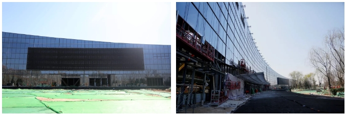 項(xiàng)目建成后,主入口位于展館西側(cè)的共享大廳,南北向的5個(gè)展館通過共享大廳相通,目前共享大廳的玻璃幕墻已安裝完畢,每塊玻璃都按照固定編號(hào)依次安裝,不同弧度的玻璃面完美拼接,將大廳的流動(dòng)設(shè)計(jì)感盡顯無疑。共享大廳外立面的LED大屏頗為搶眼,高約8米、長約43米的LED大屏日后將用于不同展館布展介紹情況等宣傳使用。在室外部分,正在進(jìn)行廣場綠化和管道鋪設(shè)等施工,工人們有條不紊地完善著室外施工細(xì)節(jié)。