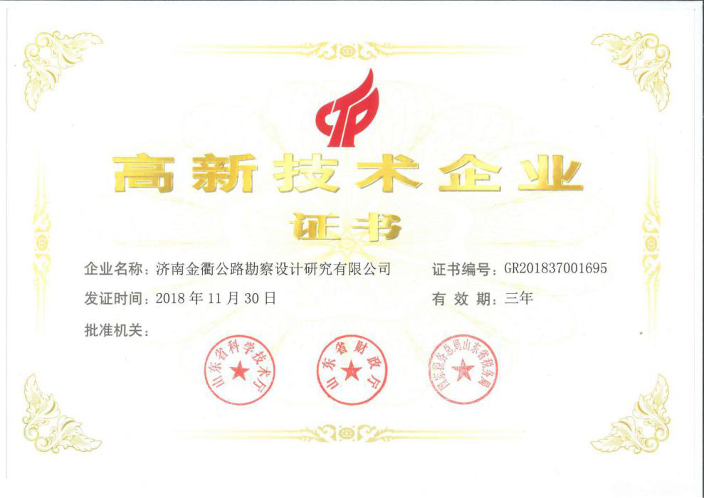 2019年3月14日,金衢公司喜獲由山東省科學技術廳、山東省財政廳、山東省國家稅務局和山東省地方稅務局聯合頒發的高新技術企業證書,這標志著金衢公司正式邁入國家級高新技術企業行列。