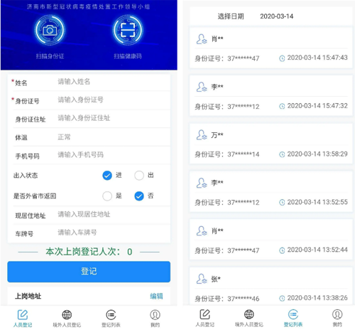 為切實保障濟陽區濟陽、濟北11個社區居民的生命安全和身體健康,上崗前,每名志愿者都在手機上安裝了“濟南易通行”APP,利用高科技軟件對社區居民每天的進出狀況做好登記,既方便又快捷。