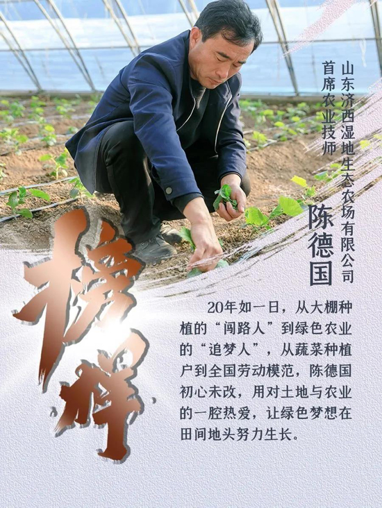作為黃河流域濟南段的“綠色明珠”,濟西濕地四季分明、五彩斑斕。濟南城市建設集團所屬山東濟西濕地生態(tài)農(nóng)場有限公司連片的蔬菜大棚里,首席農(nóng)業(yè)技師陳德國早出晚歸、“兩頭不見太陽”,無暇欣賞這近在遲尺的變幻景色,但他卻看得見春耕夏種、秋收冬藏,在深耕細作中收獲豐收的喜悅。20年如一日,從大棚種植的“闖路人”到綠色農(nóng)業(yè)的“追夢人”,從蔬菜種植戶到全國勞動模范,陳德國初心未改,用對土地與農(nóng)業(yè)的一腔熱愛,讓綠色夢想在田間地頭努力生長。