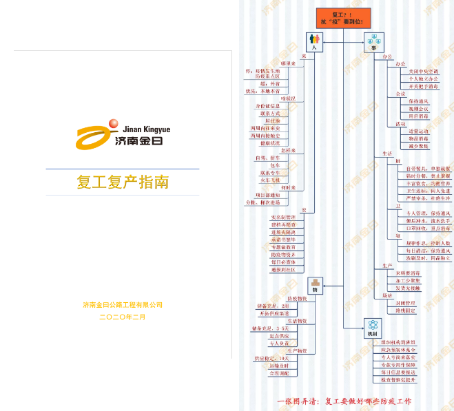 復工,要做些什么,該怎樣做?金曰公司通過一份指南明確要求,通過一張導圖防控部署。公司防控領導小組迅速傳達落實上級黨委工作部署,一手抓疫情防控,一手抓復工復產,提出復工復產的基本要求、指導意見。職能部門繪制思維導圖,對人員如何來、怎樣保安全,做哪些準備工作,體制機制的健全,辦公、生活、生產等防疫要點,加以明確,一目了然。