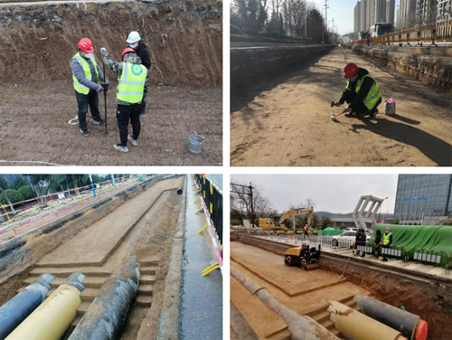 超前策劃,優(yōu)化方案,保證施工有序推進(jìn)。“工期緊、任務(wù)重”是本工程最大的特點(diǎn),各種新建管線約20公里,管線安裝工期僅有40天。按照最初的設(shè)計(jì)方案,各管線位置分散在快車道、人行道、綠化帶等不同的區(qū)域,施工區(qū)域大,管線高程沖突、干擾明顯,無(wú)法實(shí)現(xiàn)快速、同時(shí)施工,且全線受多處河道、繞城高速、交叉路口及橫穿管線等難度較大節(jié)點(diǎn)制約,不利于后期恢復(fù),也不能滿足施工期間的通行要求。經(jīng)過多次研究重新確定各種管線位置分布,將所有管線集中在一起施工,按照“確保大管徑位置、小管徑上翻”原則,采取“大管線靠南超前施工,小管線靠北跟進(jìn)施工”形成流水作業(yè),保證高效建設(shè)、快速恢復(fù)、按時(shí)通車。工程開工后,各參建分公司迅速行動(dòng),調(diào)集精銳力量和充足資源保證快速施工,3月30日按期完成所有管線安裝,4月15日道路基層全部完成,4月20日附屬工程全部完成。