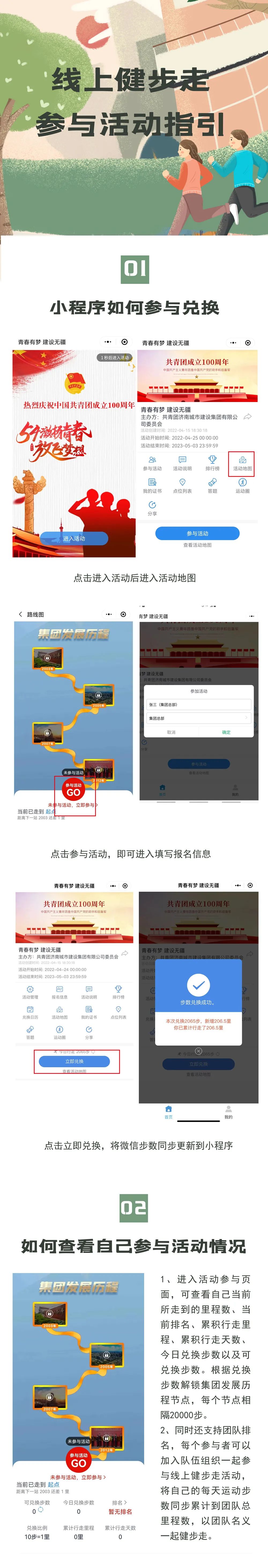 為慶祝建團100周年,開展好“百年崢嶸、初心不改、青春與共、砥礪前行”主題教育實踐活動,展現集團自成立以來的光輝歷程,賡續集團紅色精神、凝聚集團奮進力量,不斷增強廣大職工的身體素質和健康水平,不斷提高集團的凝聚力和向心力。由共青團濟南城市建設集團有限公司委員會主辦,共青團濟南金曰公路工程有限公司委員會、濟南新城文化傳媒有限公司承辦的“青春有夢 建設無疆”——職工線上健步走活動將于今晚零點正式上線,活動時間為2022年4月25日——5月3日(共十天)。