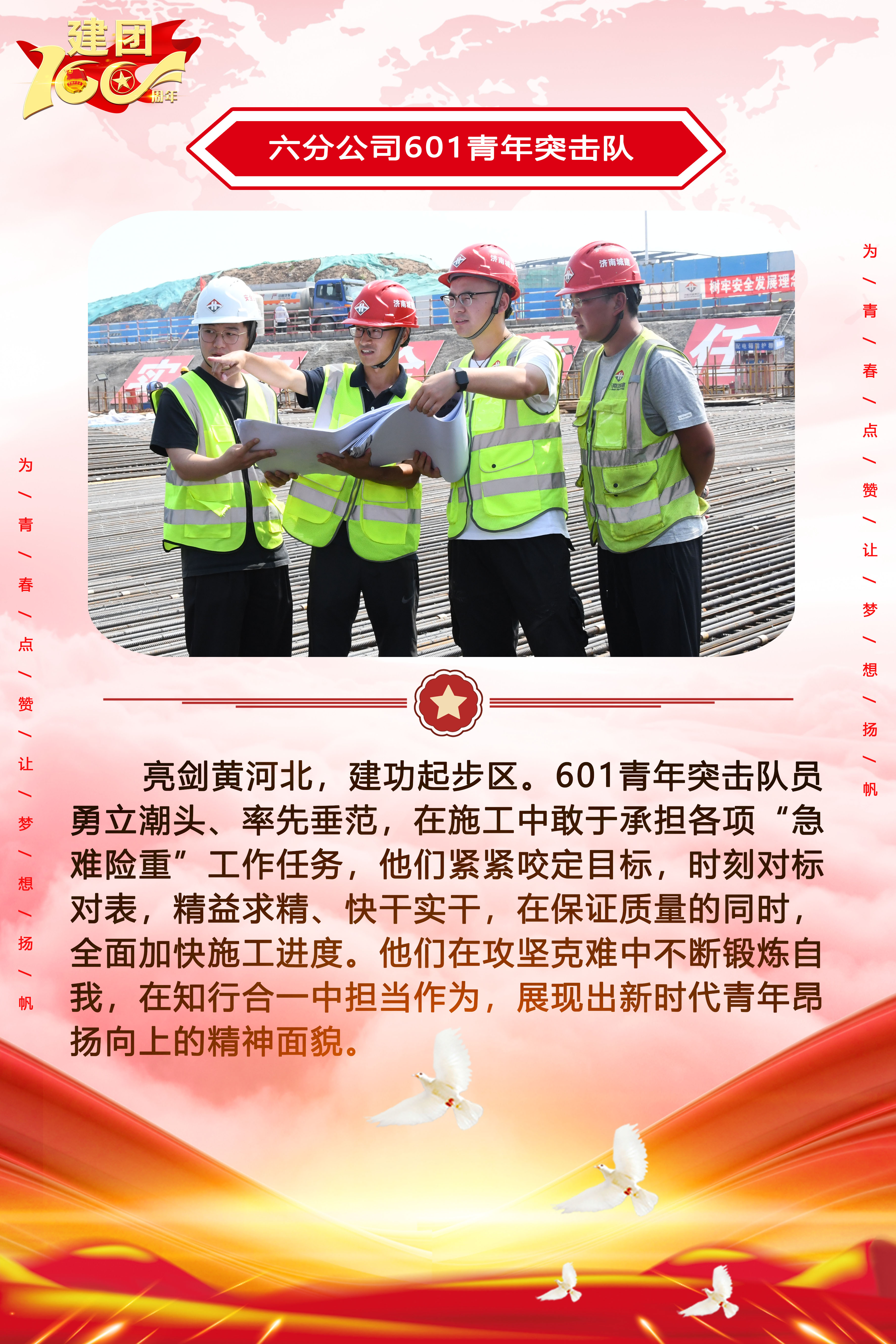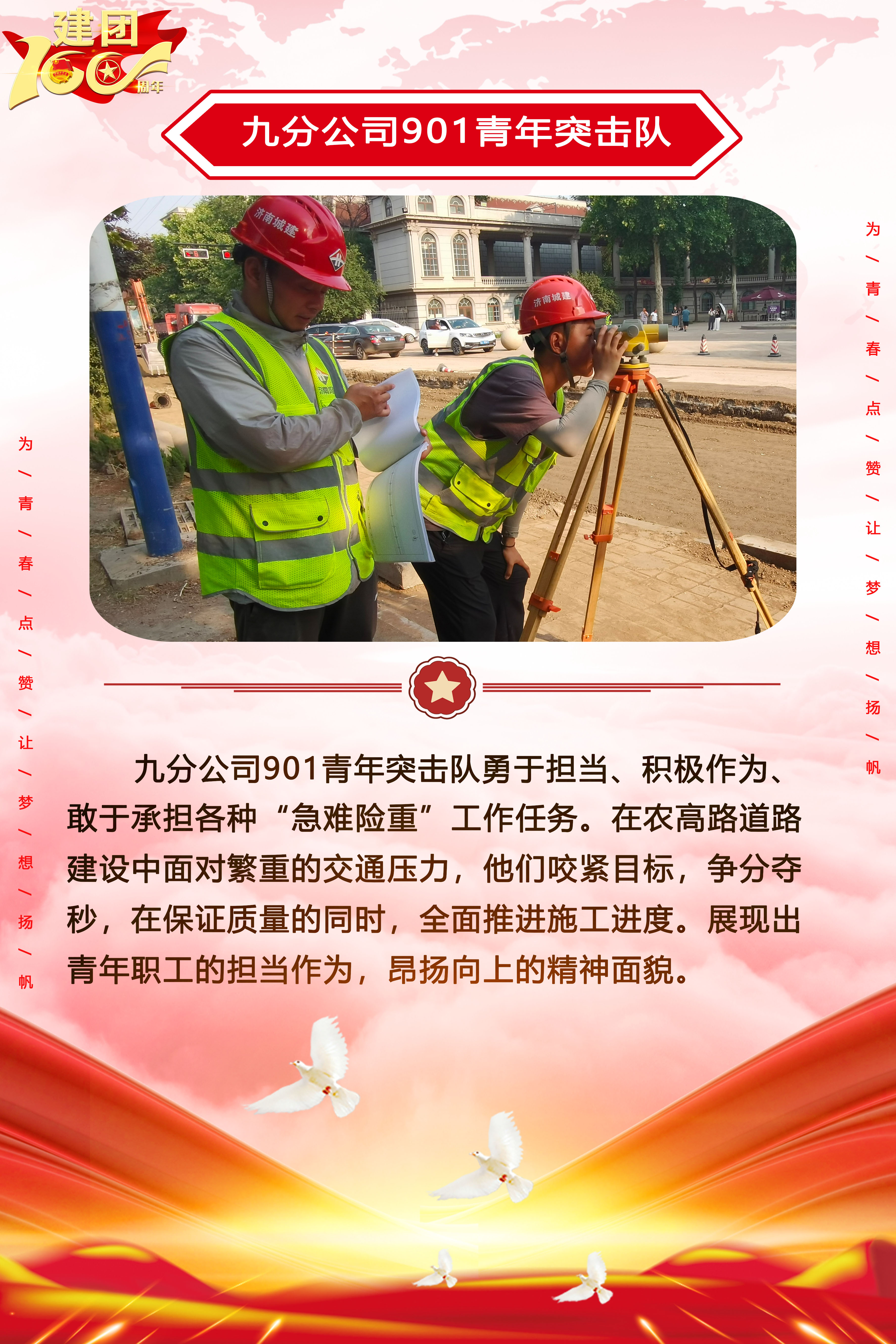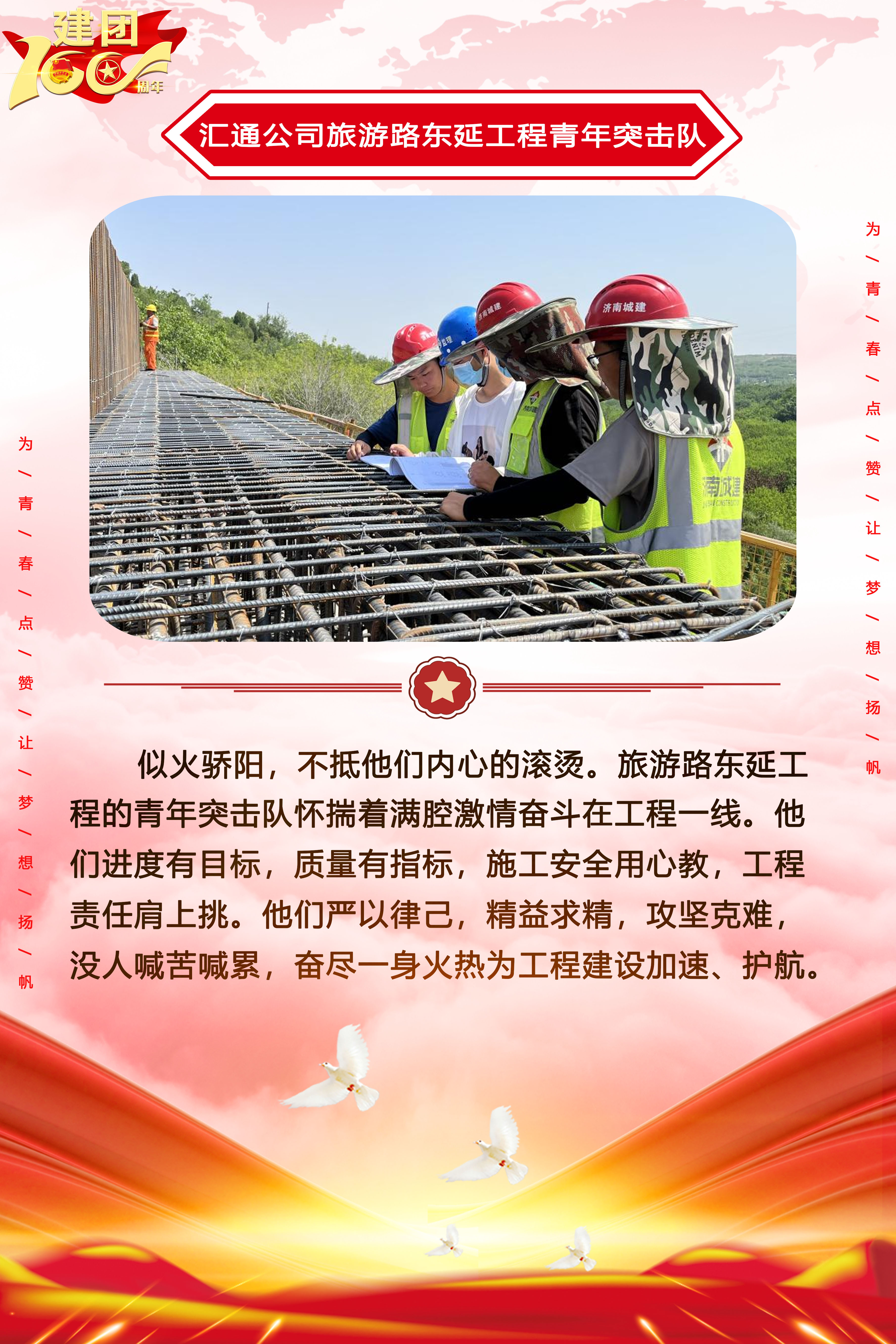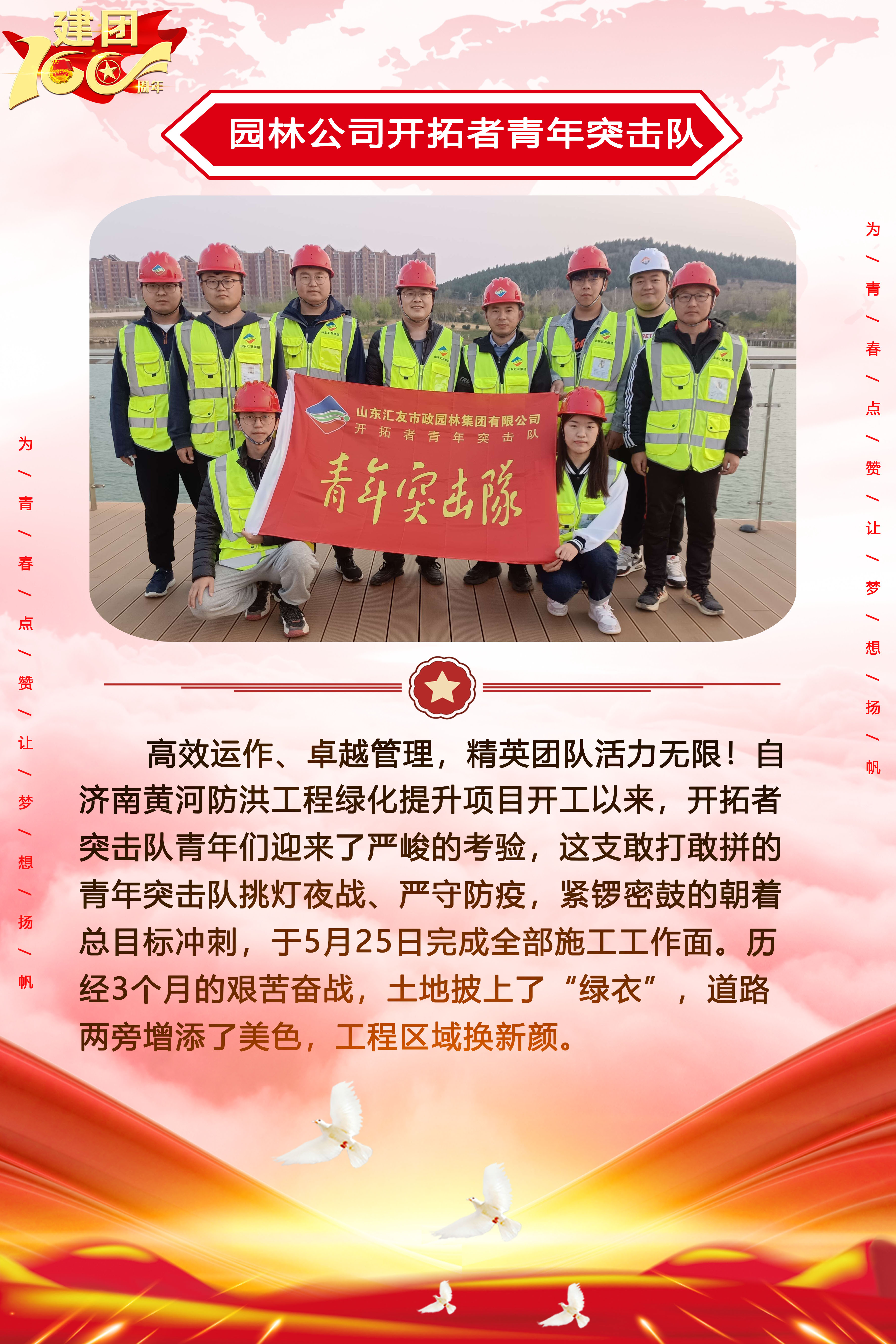 為慶祝中國(guó)共產(chǎn)主義青年團(tuán)成立100周年,深情回顧共青團(tuán)發(fā)展歷程,進(jìn)一步增強(qiáng)廣大團(tuán)員青年敬團(tuán)、愛團(tuán)意識(shí),提升團(tuán)組織的凝聚力和向心力,展示公司團(tuán)員青年積極向上、奮發(fā)有為的精神風(fēng)貌,集團(tuán)第四團(tuán)委——濟(jì)南城建集團(tuán)有限公司團(tuán)委持續(xù)開展團(tuán)旗在城建飄揚(yáng)合影活動(dòng)。