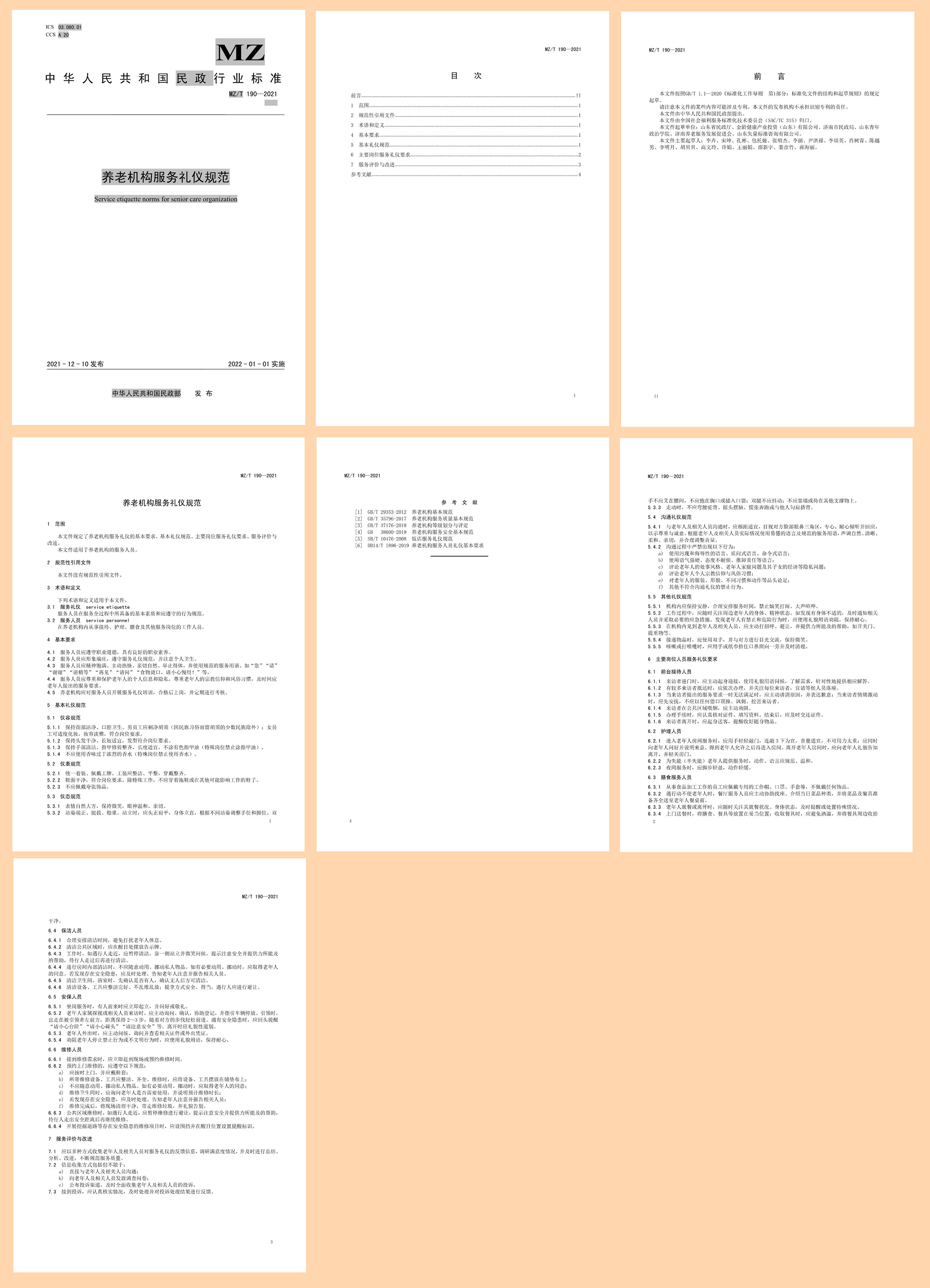 《養(yǎng)老機構(gòu)服務(wù)禮儀規(guī)范》規(guī)定了養(yǎng)老機構(gòu)服務(wù)禮儀的基本要求、基本禮儀規(guī)范、主要崗位服務(wù)禮儀要求、服務(wù)評價與改進,適用于所有養(yǎng)老機構(gòu)的服務(wù)人員。
