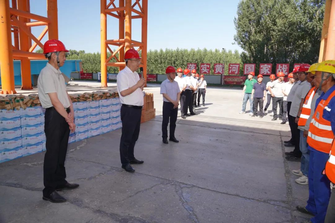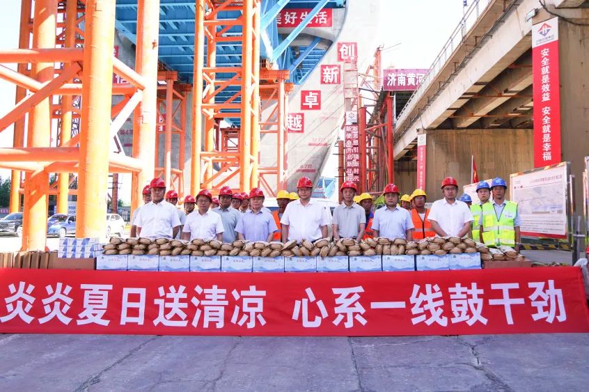 活動(dòng)中,史海成一行先后前往 G104 濟(jì)南黃河公路大橋擴(kuò)建項(xiàng)目、黃河體育中心專業(yè)足球場(chǎng)項(xiàng)目,詳細(xì)了解了現(xiàn)場(chǎng)施工進(jìn)度、工程質(zhì)量、安全文明施工等情況,并與一線員工親切交流,感謝他們長(zhǎng)期以來(lái)為項(xiàng)目建設(shè)及企業(yè)發(fā)展作出的貢獻(xiàn),為一線員工發(fā)放防暑降溫物資。