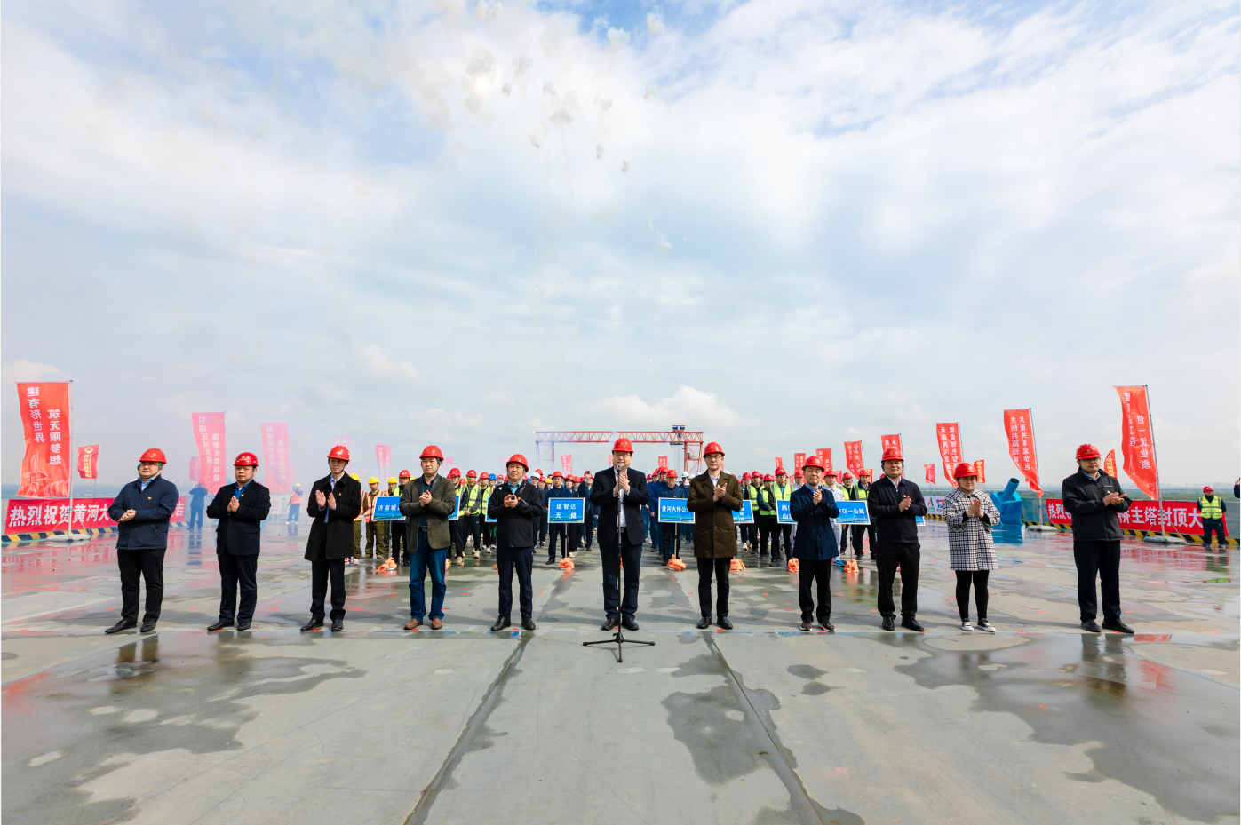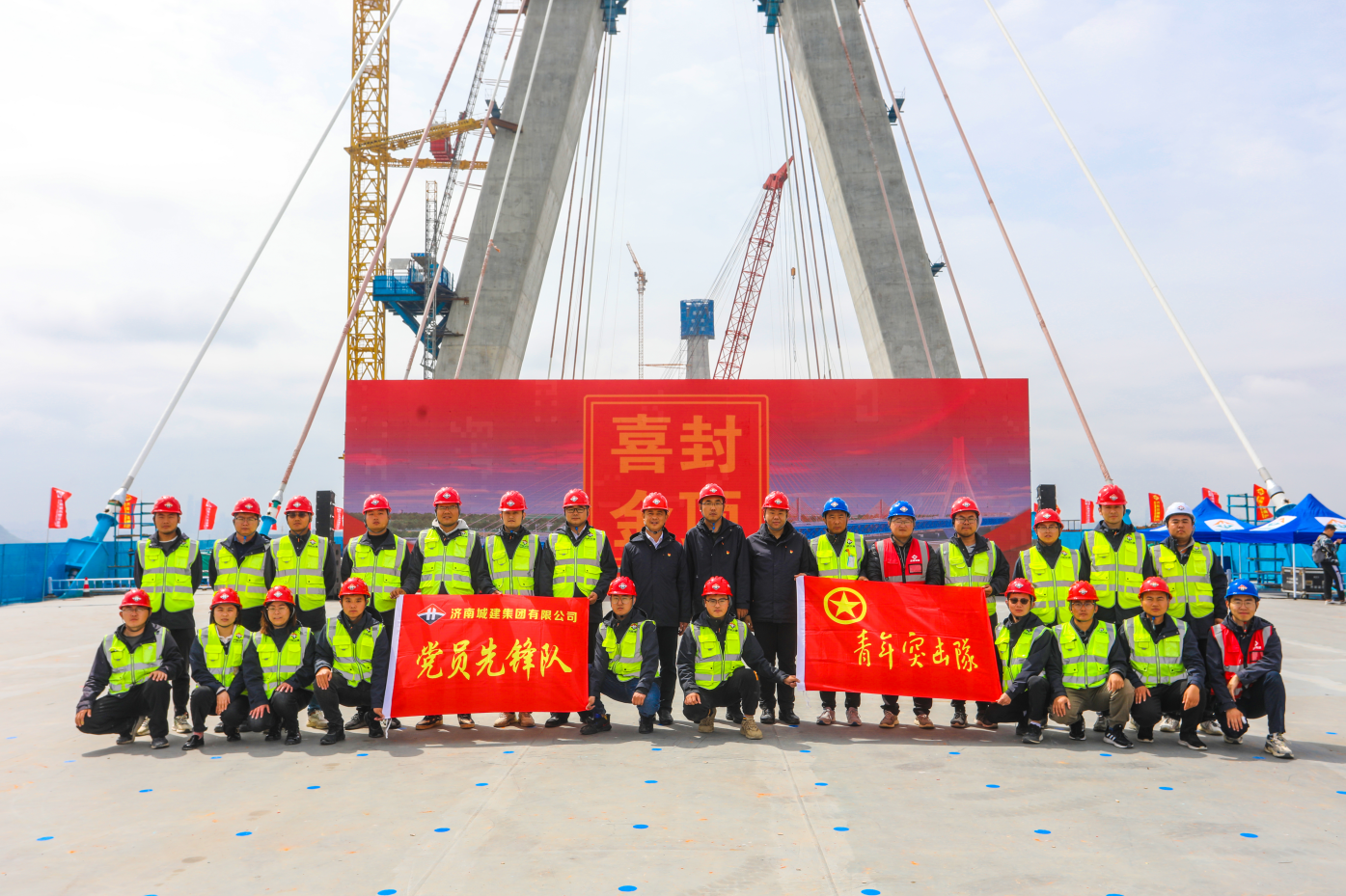 4月28日上午,由濟南城市建設(shè)集團負責(zé)建設(shè)的濟南黃河公路大橋工程主塔順利封頂,較原計劃工期提前5個月實現(xiàn)關(guān)鍵性重大控制節(jié)點突破,為大橋項目建成通車奠定堅實基礎(chǔ)。市委主題教育第十七巡回指導(dǎo)組組長楊長軍及指導(dǎo)組成員觀摩指導(dǎo),建設(shè)集團黨委書記、董事長史海成宣布封頂,黨委副書記、總經(jīng)理許為民,集團總經(jīng)理助理、安全總監(jiān)解漢忠參加活動。