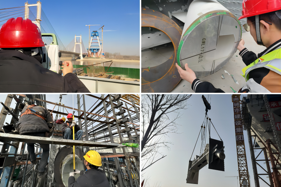 主塔上塔柱鋼錨梁共17對,單個最大重量9.3噸,索導(dǎo)管長度最大達5.4米。項目部根據(jù)導(dǎo)管尺寸,專門設(shè)計定制管口測量工裝,在鋼錨梁吊裝前安裝定位工裝,實現(xiàn)吊裝動態(tài)觀測,將“隱形點”可視化,保證了預(yù)埋準(zhǔn)確度,大幅提升施工作業(yè)工效。