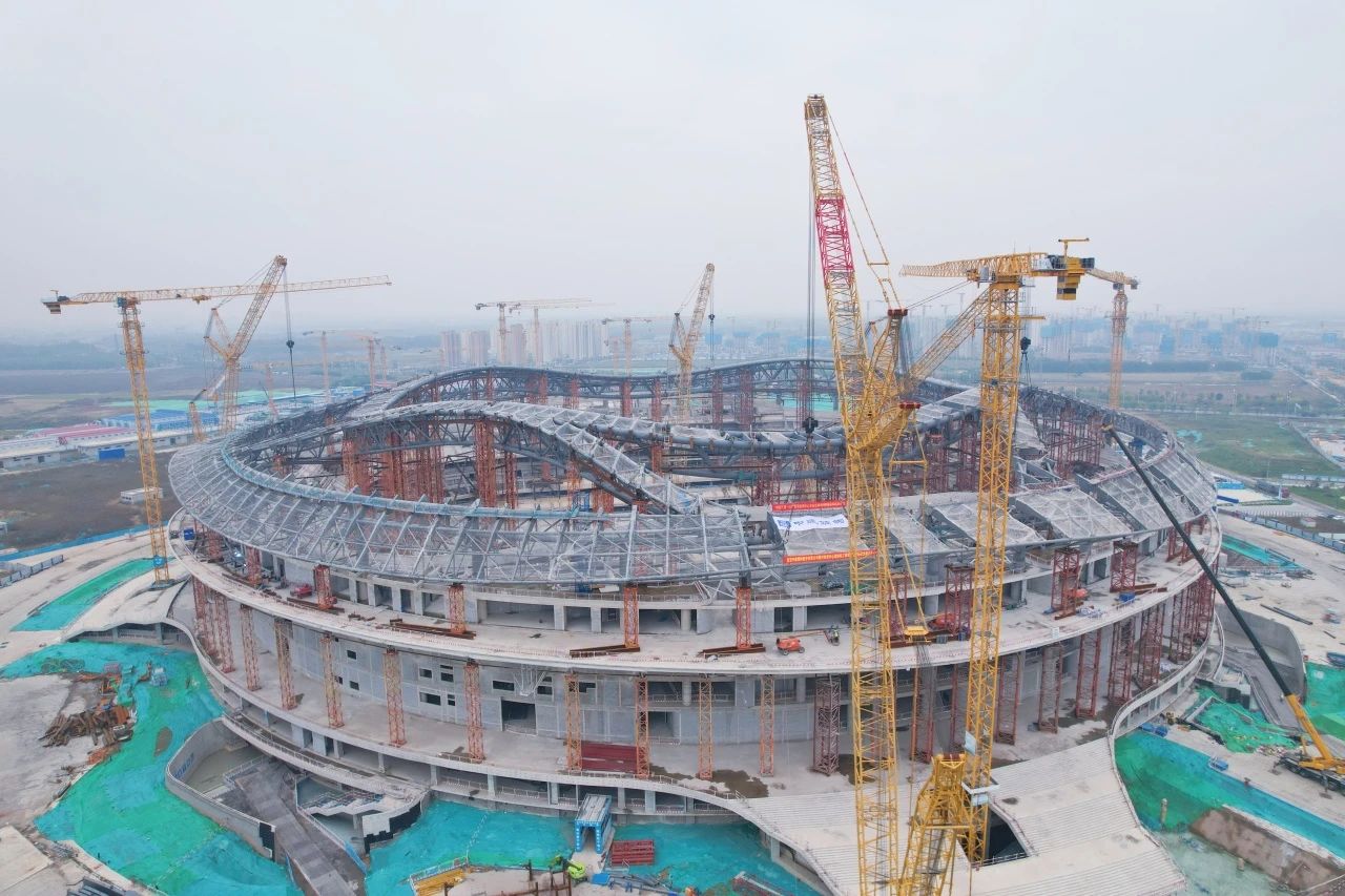 項目鋼結構施工擁有多項國內之最,屋蓋鋼結構最大懸挑長45米,是國內體育場館懸挑長度之最;施工跨越夏秋冬三季,溫度變化會形成巨大誤差,累積合龍段施工難度為目前國內之最;鋼結構拼裝完成后,需要將支撐胎架進行分級卸載,卸載過程中產生的變形量是國內同類場館之最。