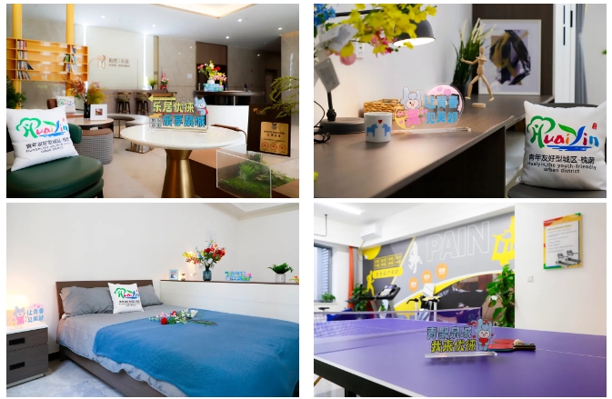 區(qū)別于普通出租公寓、酒店賓館,根據(jù)青年喜好,植入專屬LOGO 、IP形象等青春元素。房間內(nèi)部配備床、衣柜、書桌椅、置物架等,并有獨立衛(wèi)浴、冷暖供應,青年可“拎包入住”。公共區(qū)域整體打造自助辦公、學習閱讀、運動健身、共享會客、休閑娛樂、自助廚房6大功能區(qū),滿足青年日常需求。